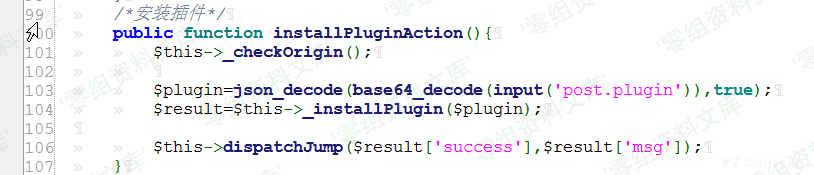回到 installPluginAction函数,接下来函数将传入的plugin参数先进行base64解密在进行json解码,接着调用_installPlugin函数,跟进该函数,如图