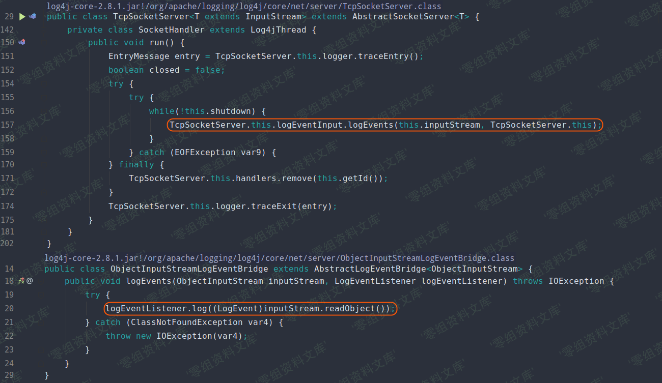 在 SocketHandler 类的 run 方法中, ObjectInputStream 对象数据被传入了 ObjectInputStreamLogEventBridge 类的 logEvents 方法,而反序列化就发生在这个方法中。