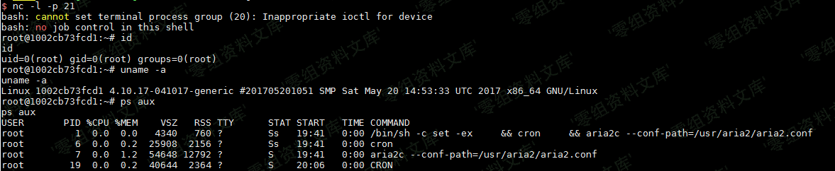 这时候,arai2会将恶意文件(我指定的URL)下载到/etc/cron.d/目录下,文件名为shell。而在debian中,/etc/cron.d目录下的所有文件将被作为计划任务配置文件(类似crontab)读取,等待一分钟不到即成功反弹shell: