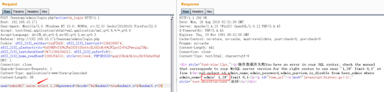 在burpsuit抓包,修改包并重放,提示如下错误,根据返回的数据包可以看到由于htmlspecialchars函数对输入的特殊符号进行html实体化转义,还有就是into、outfile关键字被过滤