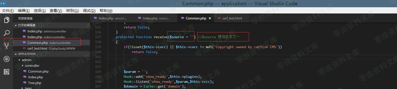 然后是ndex目录里面的Common模块里面的receive 方法获取了变量$source 值 = index获取了变量$page 值 = 1