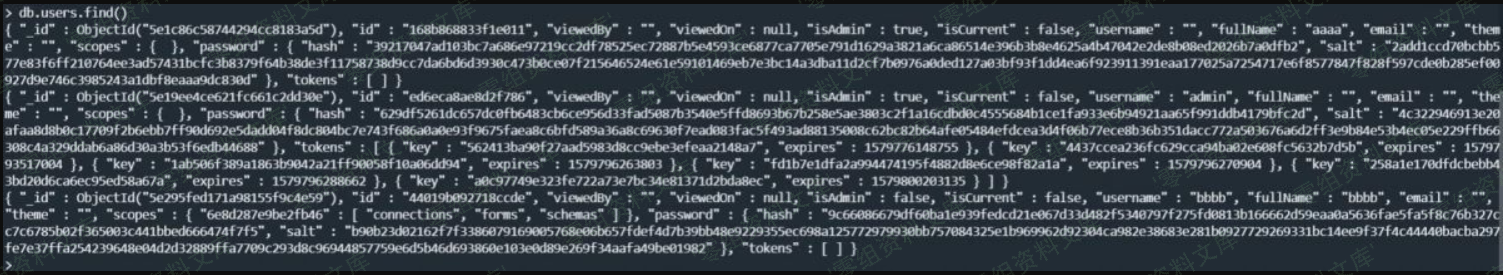 此时如果我们在数据库中查看的话可以有个更清晰的认识,如果第一个条目是aaaa账户,isadmin设置为true,第二个是admin账户,第三个是bbbb账户,每个账户password 字段包含hash,salt 和token字段。