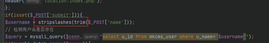 问题就出在这里,前端用户进行提交的name参数,经过了addslashes_deep()函数处理加上了一个“\”,到达reg.php页面又使用stripslashes()函数将name的值进行了去除“\”处理,这就导致出现了无过滤拼接。