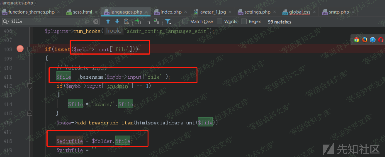 现在文件的目录结构分析完毕,接下来查看该漏洞页面的接口位置:由于该文件目录为\mybb\admin\modules\config\languages.php,因此,入口为config模板的language方法中,其中控制器为edit,从369行可以看到,同时408行看到post请求中输入file文件