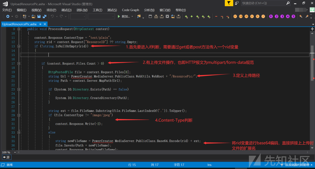 再结合第一个webshell路径:第一个shell:http://xxx.xxx.xxx.xxx./resourcePic/MQ==.ASPX 根据这个ResourcePic目录,发现是上传功能目录下UploadResourcePic.ashx这样一个文件上传后保存的位置,对其进行代码审计