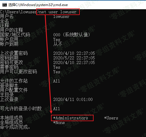 运行cmd,查看lowuser用户组,发现已经提升为administators组: