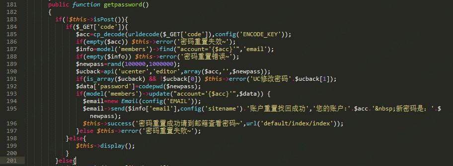 从框架上(基于CanPHP的二次开发)看不出来什么缺陷,那就来看看代码逻辑上有什么披露。来到protected/apps/member/controller/indexController.php中是一些关于会员账号的逻辑,其中的getpassword函数是找回密码的功能,其中分为两步:第一步根据用户名或者邮箱向注册的邮件发送重置密码链接;第二步根据重置密码的链接重置用户密码,然后再将新密码发送到对应邮箱。第二步代码如下:
